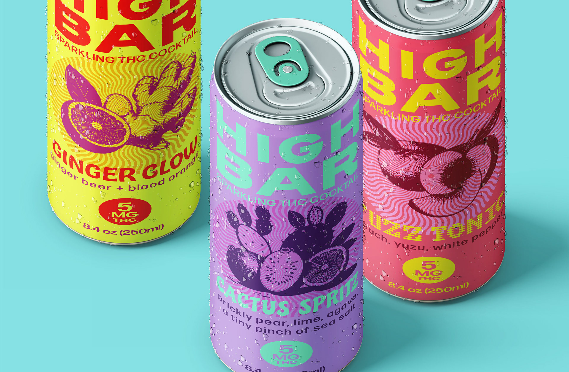 High Bar is a sparkling THC cocktail created for moments of lightness, social ease, and sensory pleasure. We designed the packaging to feel confident, collectible, and culturally in tune—with bold typography, vibrant color, and flavor forward illustrations for maximum taste appeal.