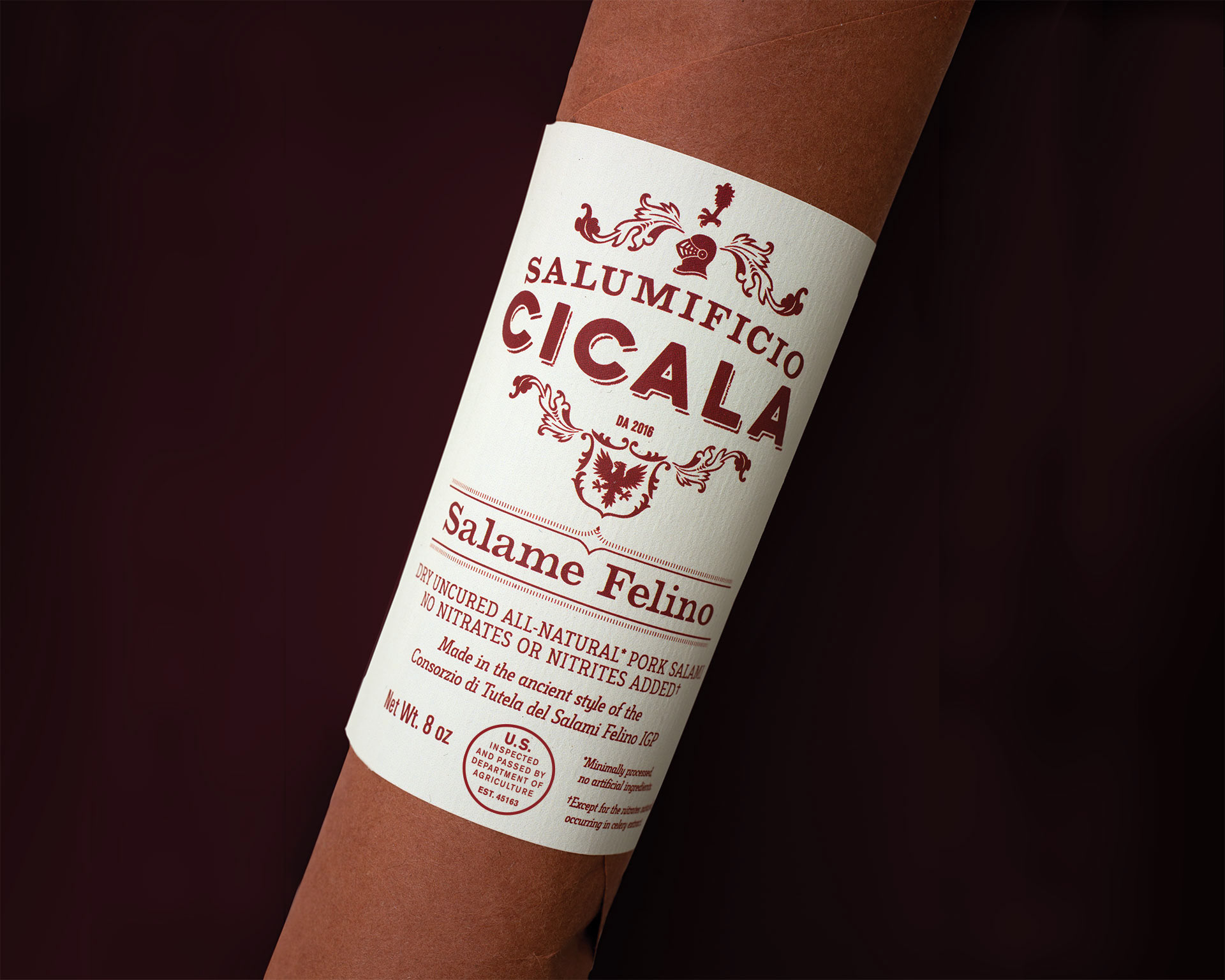 Logo and packaging design for a family-owned and operated small batch producer of all-natural artisanal Italian salami and cured meats. The logo is derived from the Cicala family crest.
