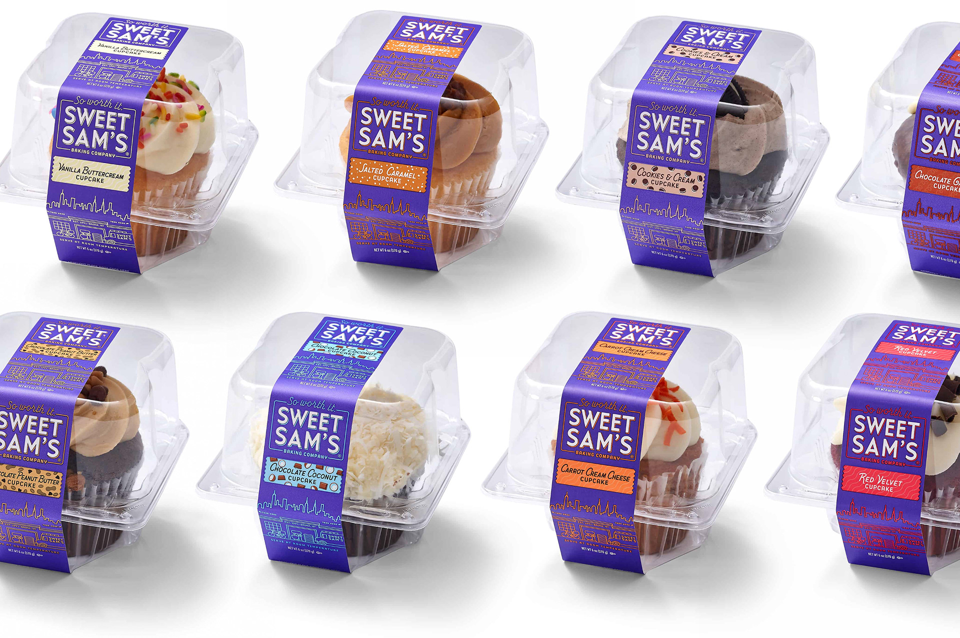 Unlike their competitors, Sweets Sam's uses only the finest ingredients (like real butter!) in their iconic sweet treats. They needed to modernize their brand in a way that is still recognizable to their current customers while attracting a new younger generation of consumers. We also needed to come up with a flexible system that would work on a variety of different packaging types.